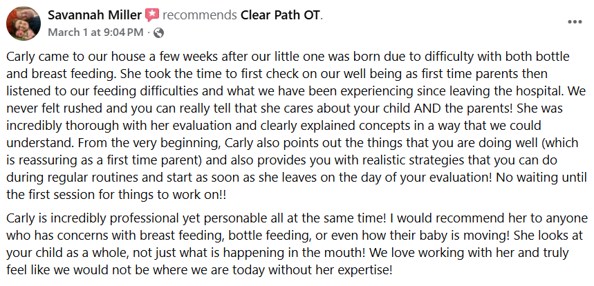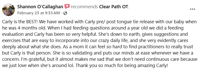 As a dual-certified provider in both occupational therapy and lactation consulting, my mission is to provide skilled, evidence-based, compassionate support to infants and their families to support occupations (eat, sleep, poop, & play!) throughout the first year of life and beyond.